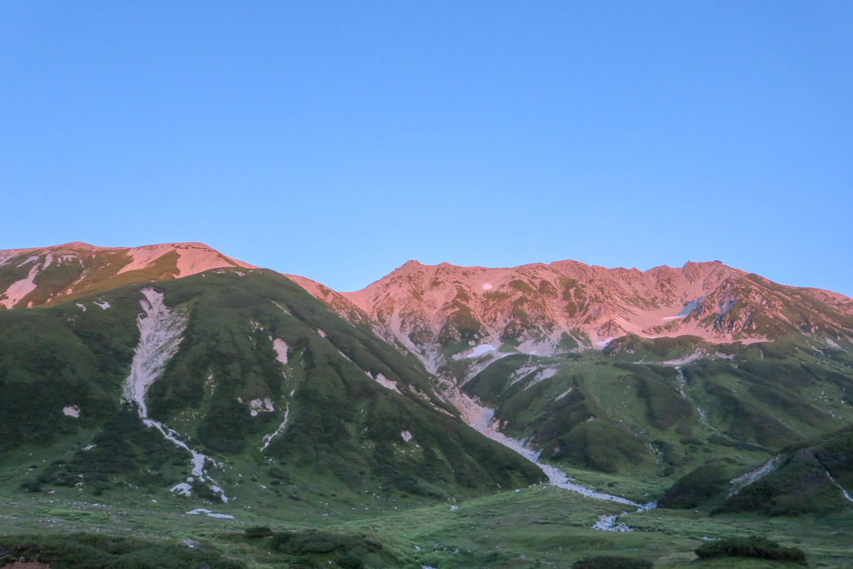 明日登る尾根を横目に見つつ、再び室堂経由で雷鳥沢へ帰る。