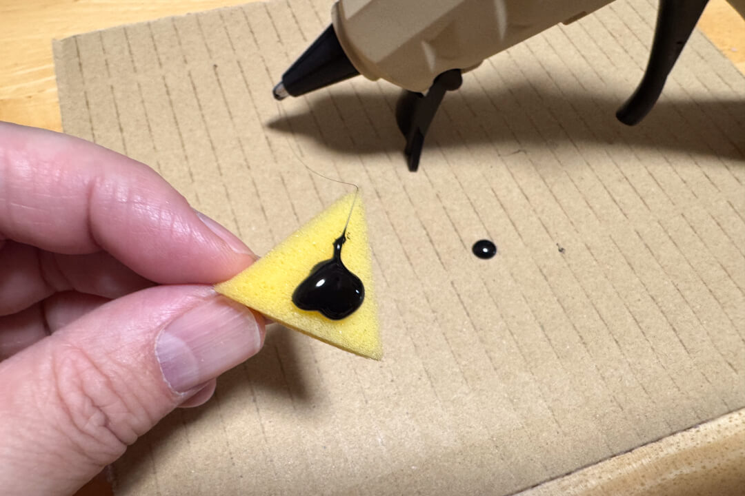 そうしたら、スポンジにグルーガン(専用の棒状プラスチックを溶かして接着する道具)で接着剤を少し付ける。あまり付けすぎないように。