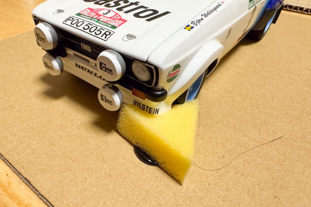 この時補助灯など壊れやすい部分は避ける。あと接着剤が車両に付かないように気をつけて。
