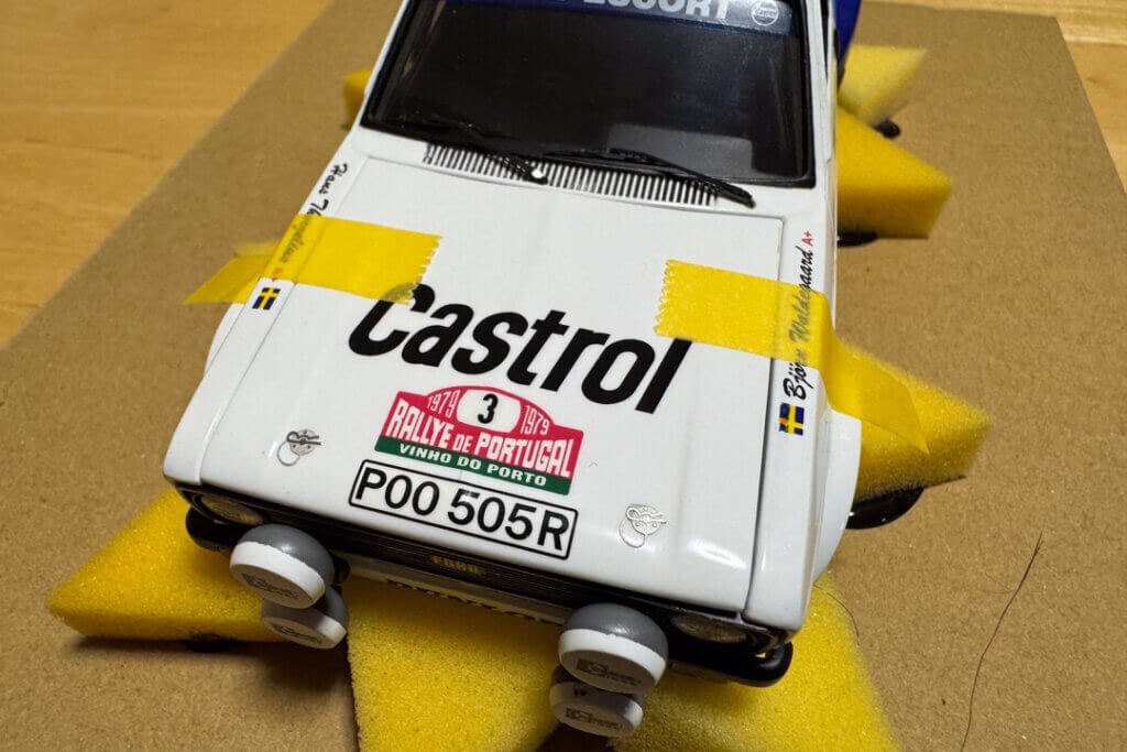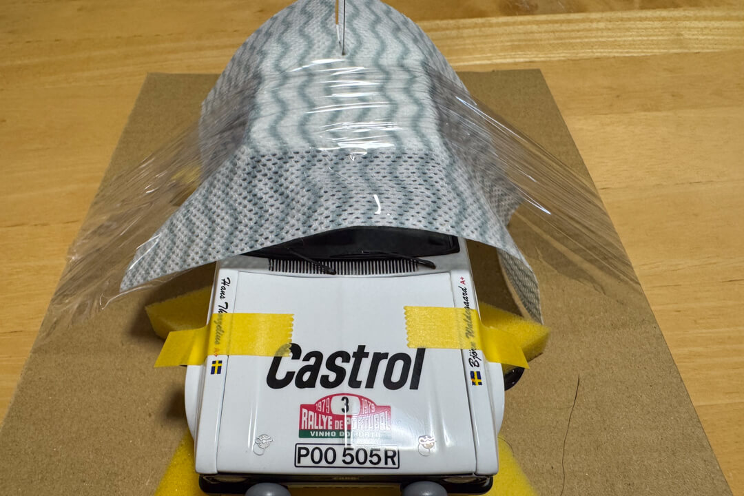 この車はE/gフードが開くからマスキングテープで固定しておく。デカールの上から全面クリア塗装してあるからロゴマークも大丈夫でしょう。