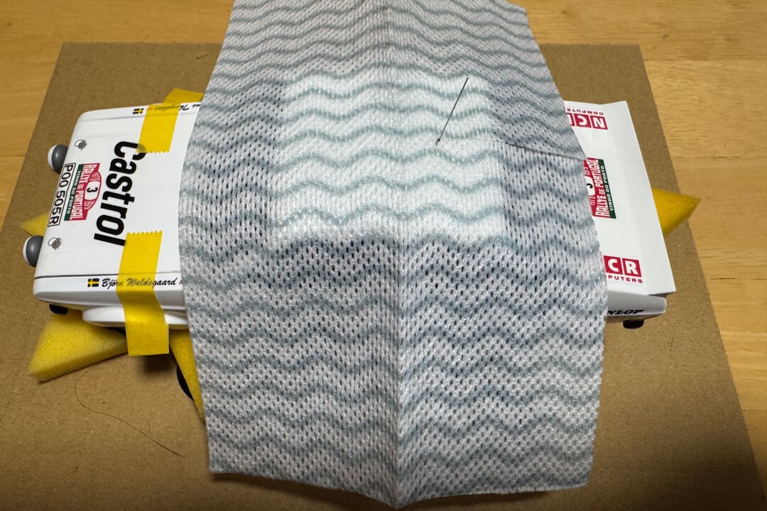 次はルーフに不織布のカウンタークロスを乗せる。大きさは適当にハサミで切って合わせた。