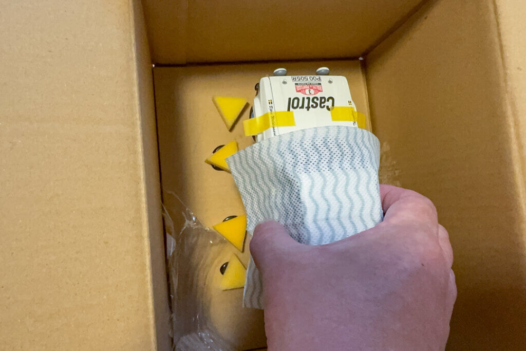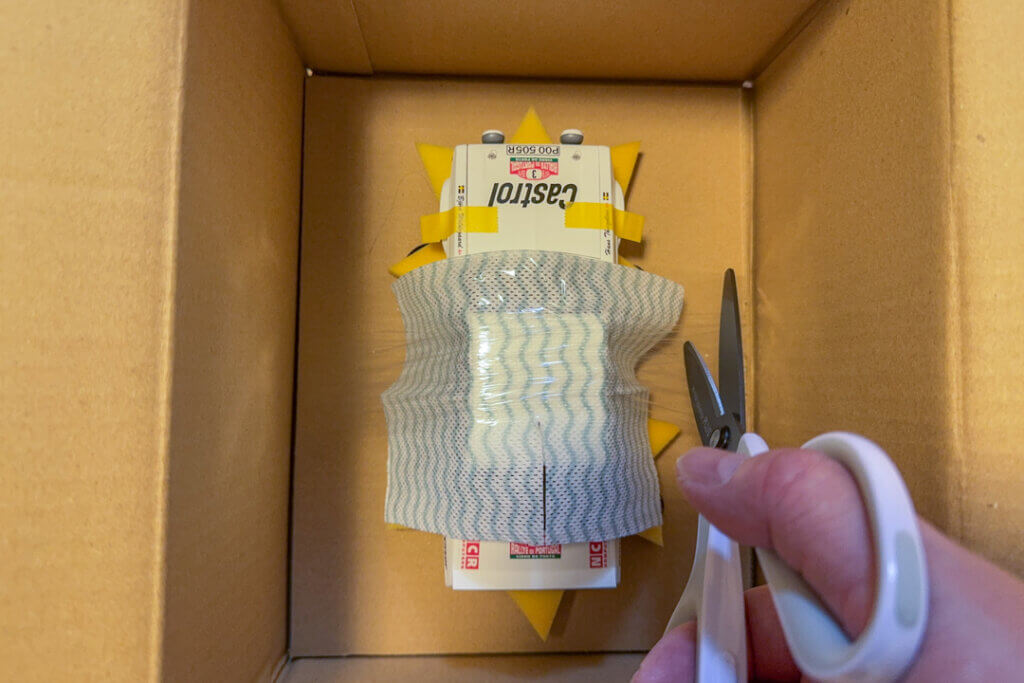 これで箱を閉じればもう大丈夫です。最初は余ったスポンジを敷き詰めようか?と思ったけど、予想以上にしっかりしてるので余計なことはやめた。