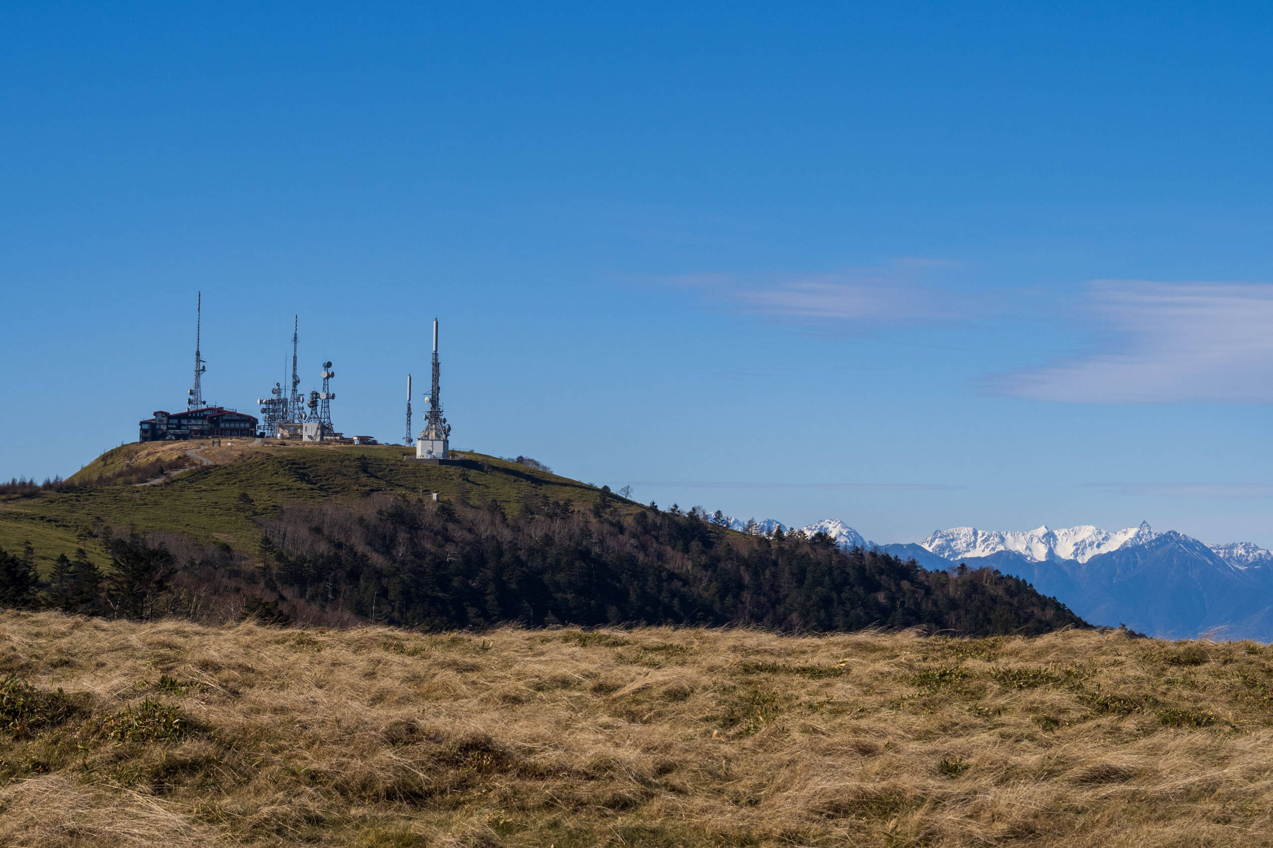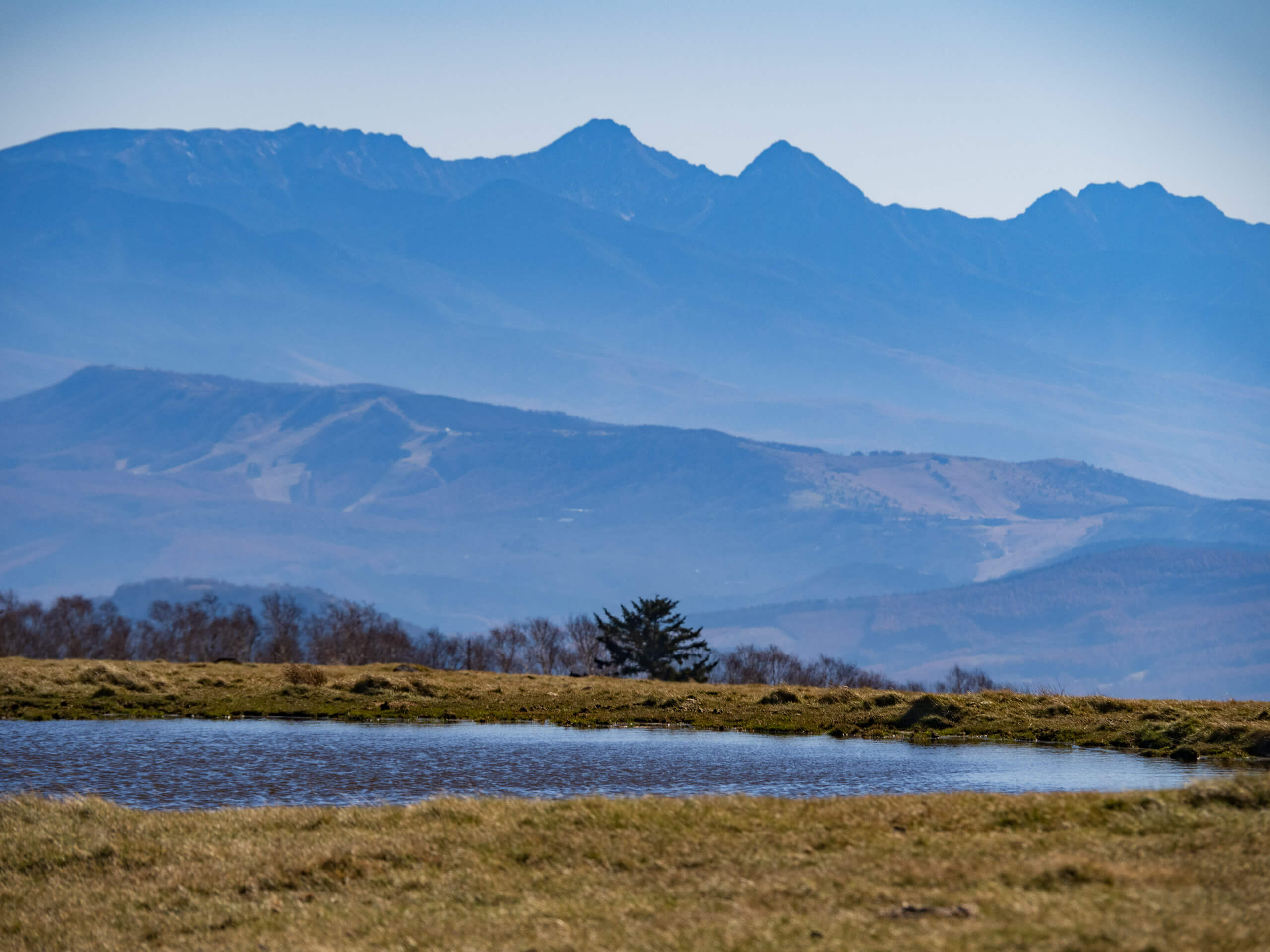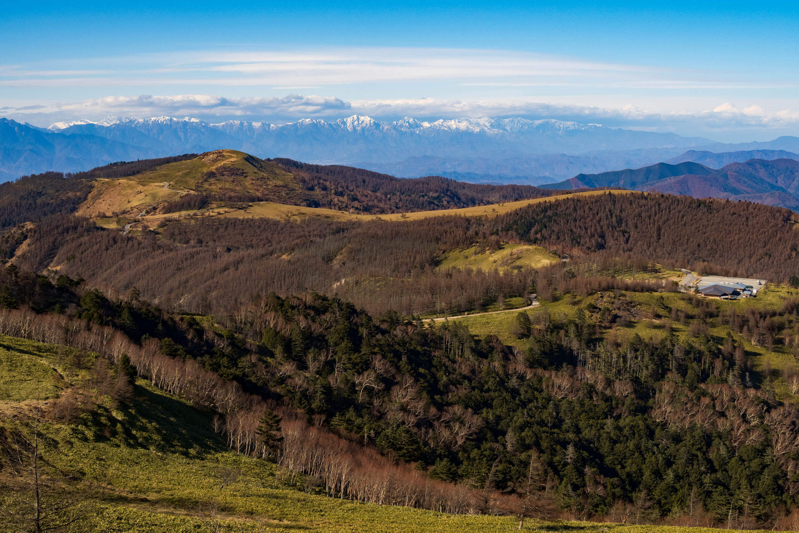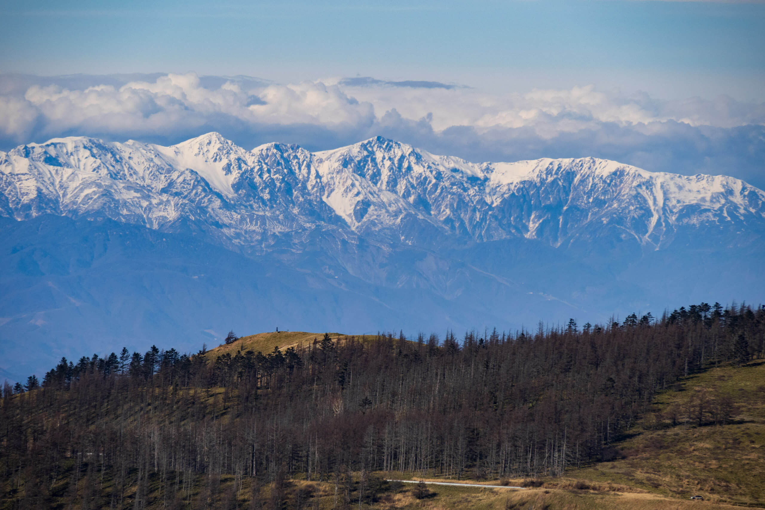 左を向くとボワーっと浮かぶ八ヶ岳と霧ヶ峰近くのスキー場「ブランシュたかやま」から男女倉山(ゼブラ山)かな。