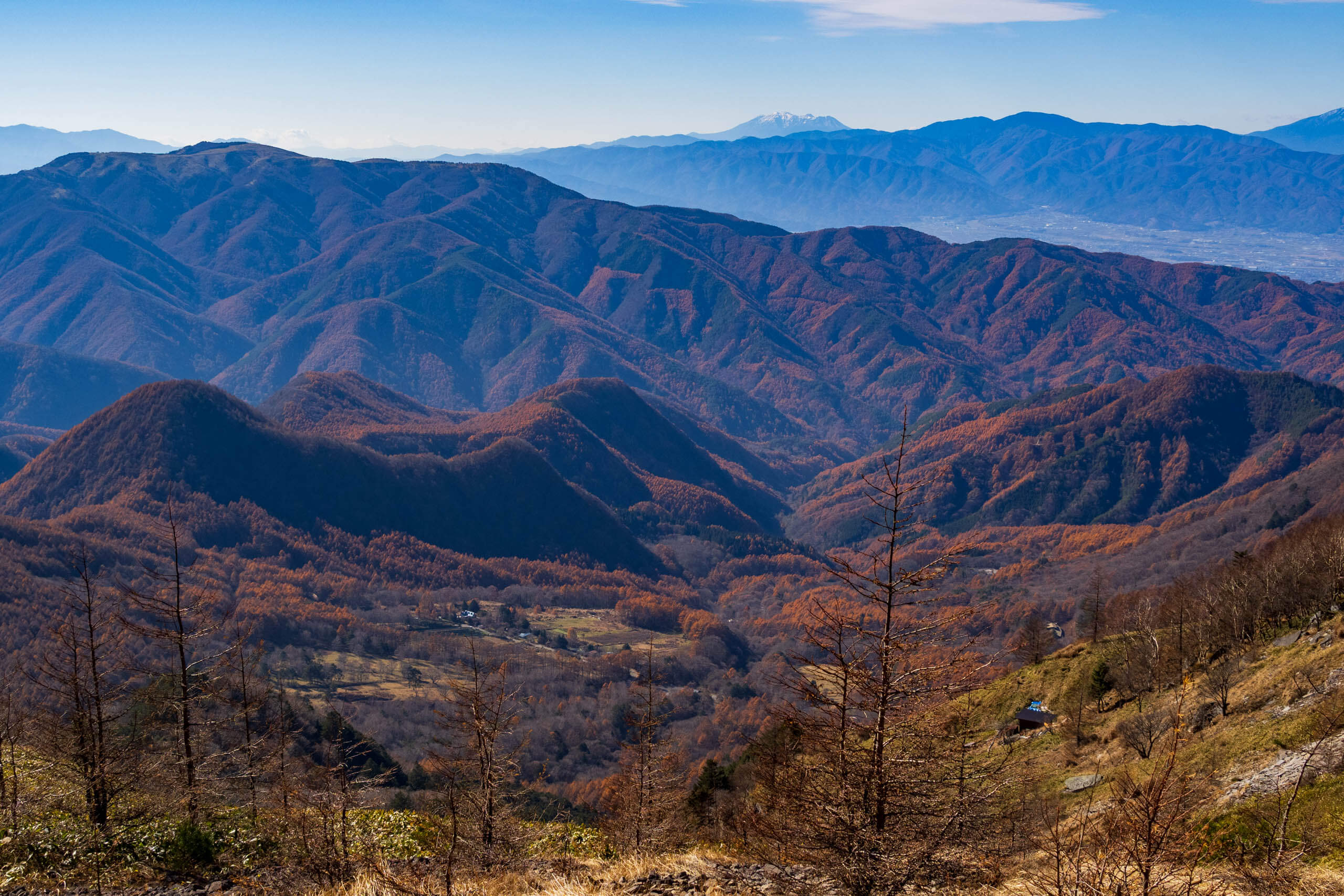 紅葉は殆ど終わりだけども、麓の唐松に陽が当たると濃いオレンジ色に輝く。