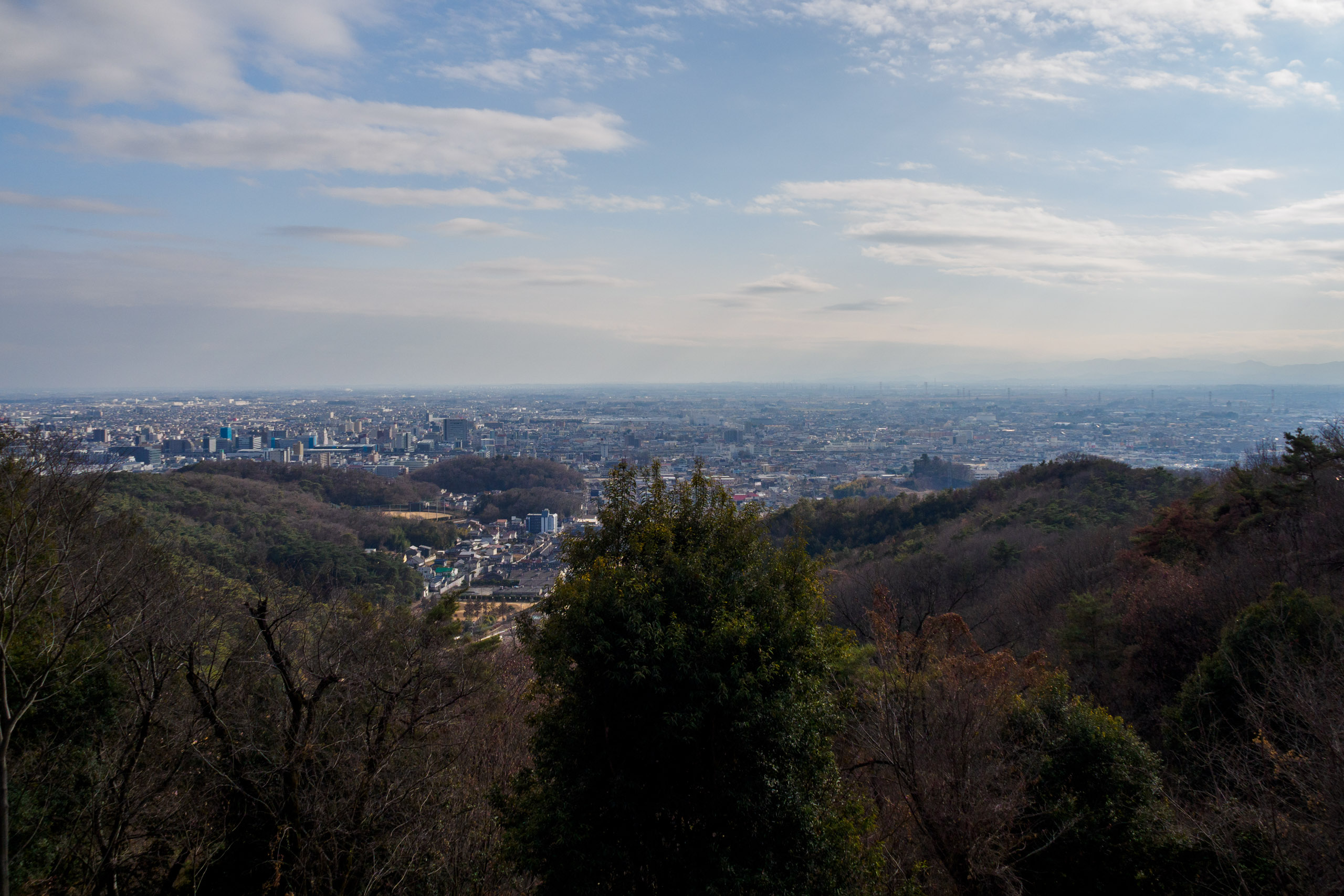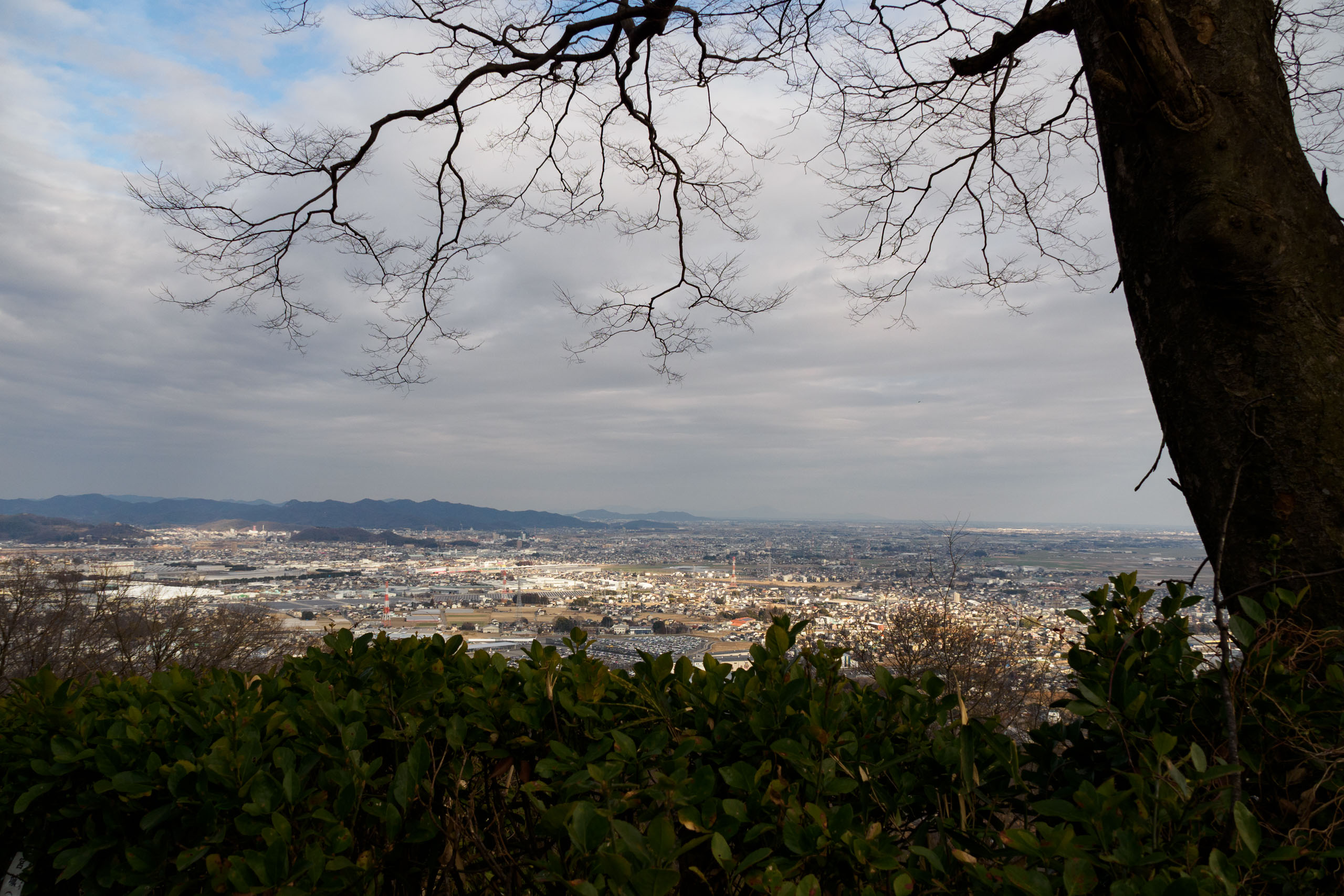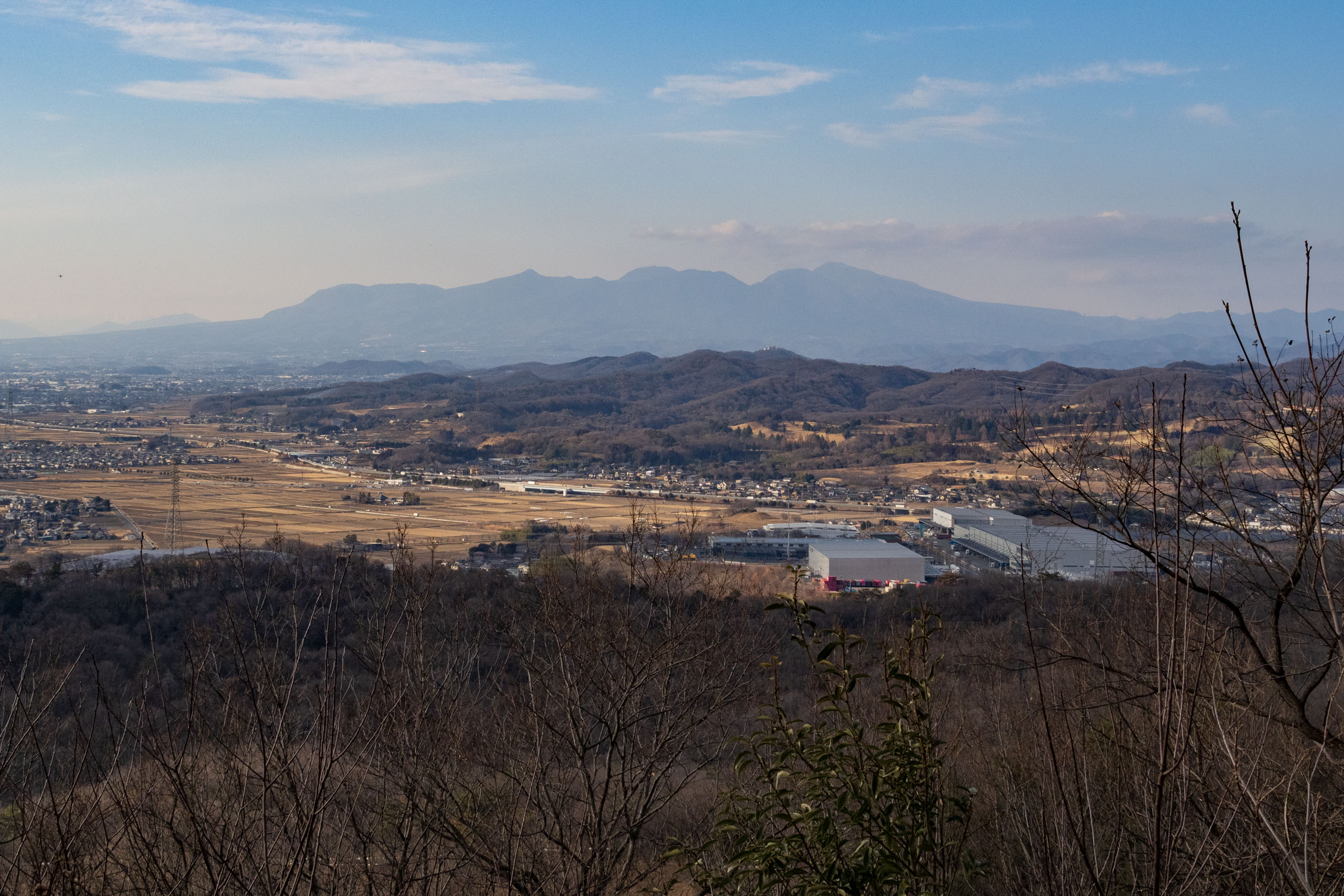 霞んでるけど関東平野の端の方だから景色は広い。たぶん秩父の方を向いていると思う。